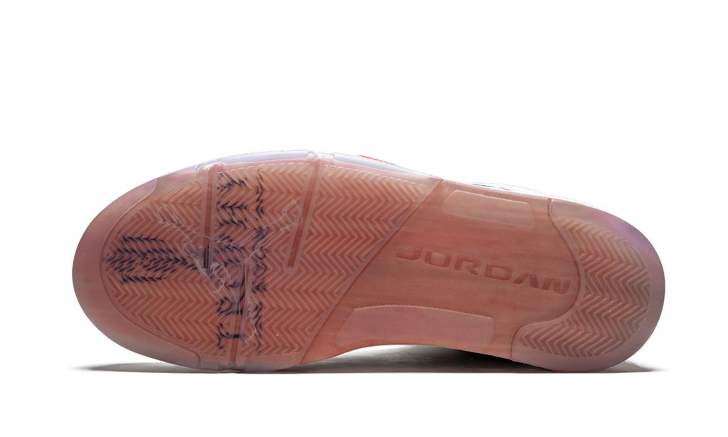 The upper of the Jordan 5 Retro "Trophy Room Ice Blue" features a mix of premium leather and synthetic material, with a tone of ice blue (Ice Blue) that brings a feeling of freshness and elegance. The Side Swoosh in silver reflection and white details add contrast, while the semi-translucent textile on the side panel and heel, which features the special Trophy Room logo, adds an exclusive and innovative touch. This elegant design is complemented by discreet gold details, such as the golden Jumpman on the tongue, which adds a touch of luxury to the model.