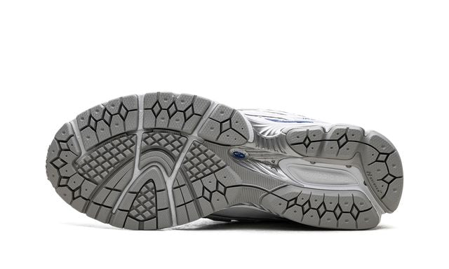 Its upper is made from breathable white mesh, ensuring lightness and ventilation, while the silver synthetic overlays add a sophisticated finish. The highlight is the details in Team Royal blue, present on the "N" side logo, on the collar and in parts of the sole, creating a vibrant and dynamic contrast.