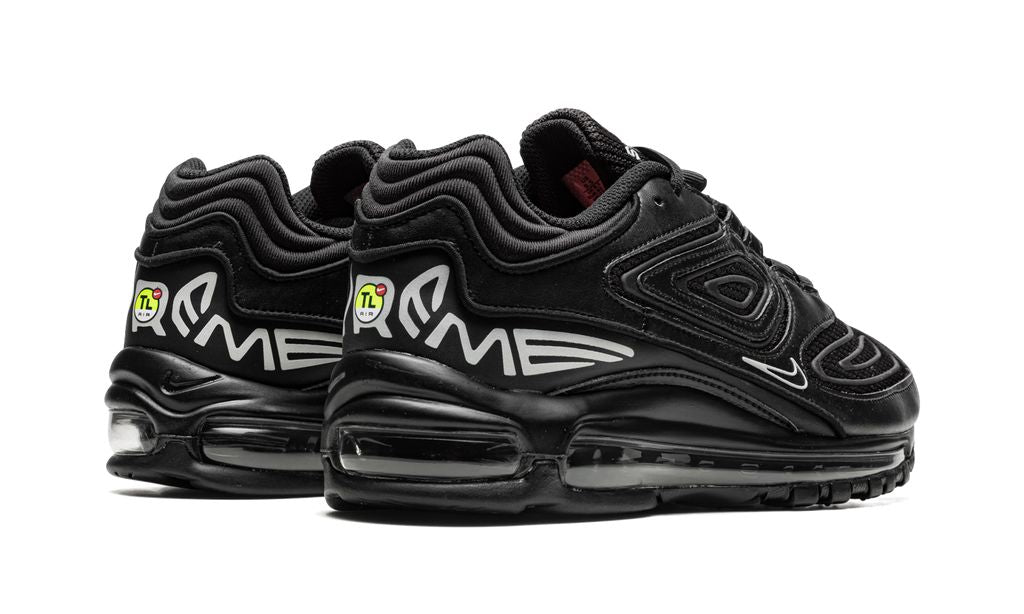The upper of the Supreme x Nike Air Max 98 TL SP Black is made from a combination of premium materials, such as leather and mesh, in a predominant tone of black, with subtle details in gray and silver. The design is a modern reinterpretation of the Air Max 98, with bolder lines and a touch of sophistication that reflects Supreme's unique identity. The Supreme logo appears discreetly on the tongue and other strategic parts of the shoe, while the Nike Swoosh is elegantly highlighted.